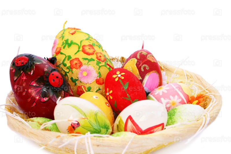 Пасхальные яйца крупным планом на белом фоне