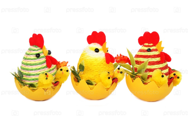 Пасхальные курицы и цыплята на белом фоне