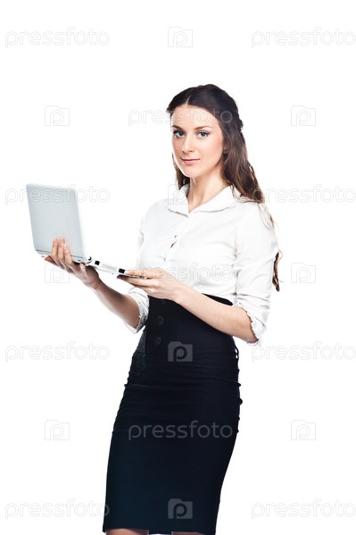 Портрет молодой, красивой и успешной деловой женщины с белым ноутбуком в руках