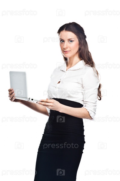 Портрет молодой, красивой и успешной деловой женщины с белым ноутбуком в руках