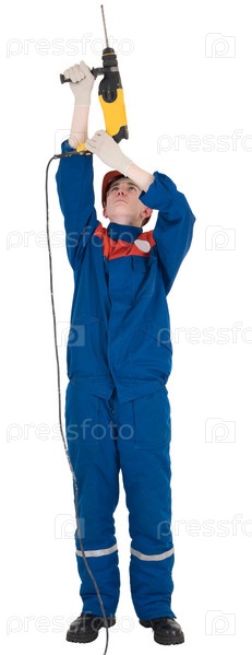 Мужчина в рабочей ткани держит на руках желтый перфоратор