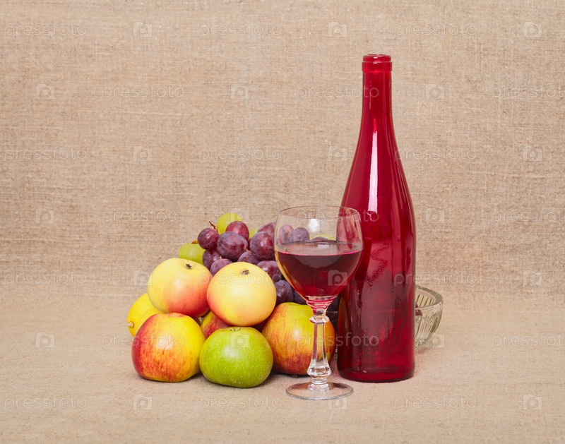 Натурморт с яблоками, виноградом, бутылкой и бокалом красного вина