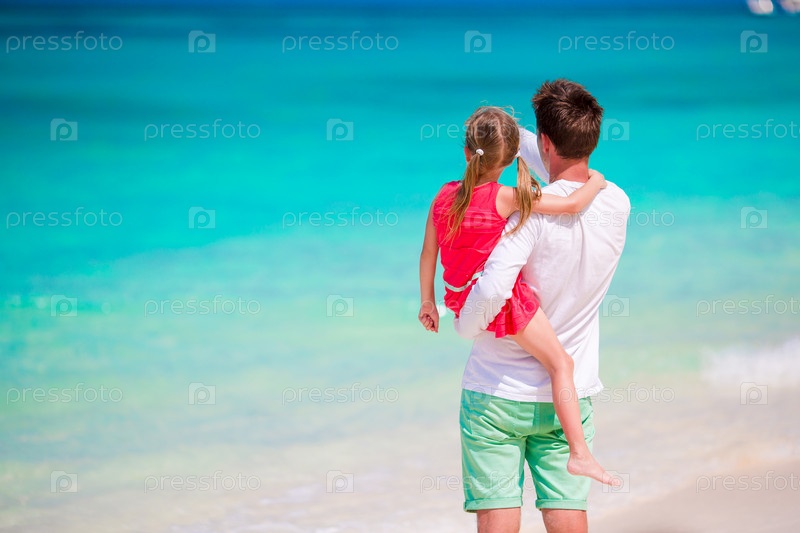Счастливый отец и дочь на тропическом пляже