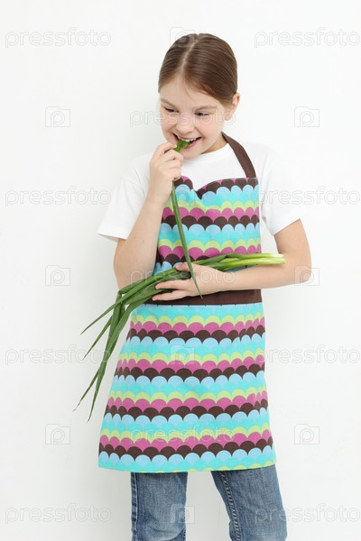 Девочка ест зеленый лук