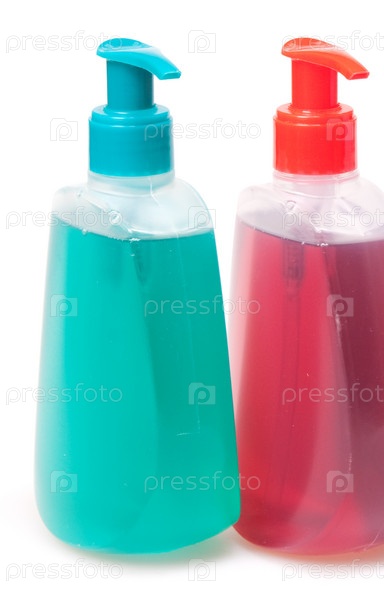 Две бутылки с мылом на белом фоне