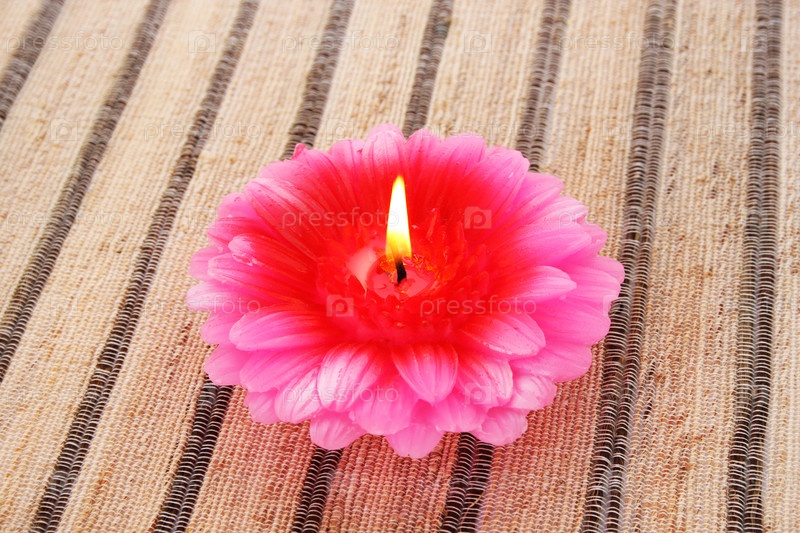 Свеча в виде цветка на полосатом коврике