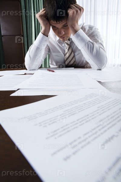 Усталый бизнесмен, прикасающийся к голове, сидит за столом и смотрит на документы