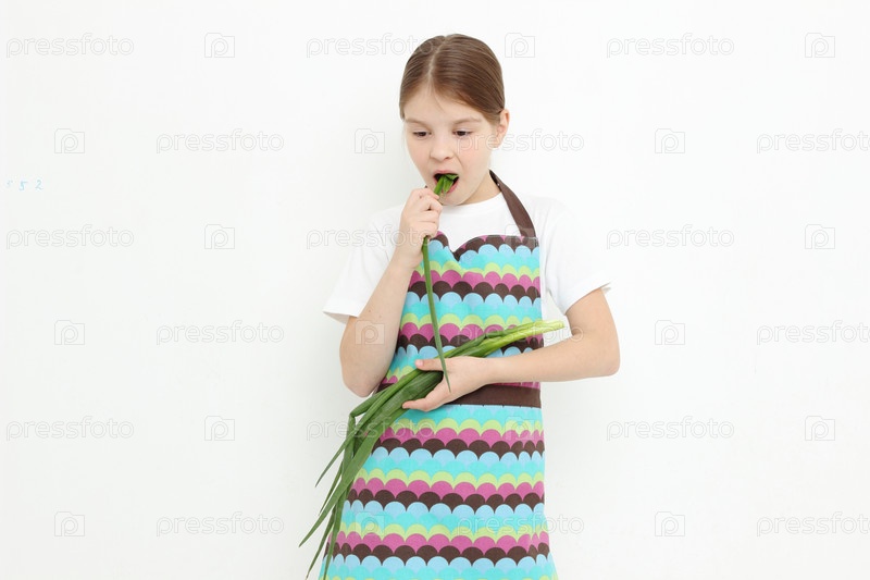Симпатичная девочка есть зеленый лук