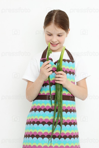 Симпатичная девочка есть зеленый лук