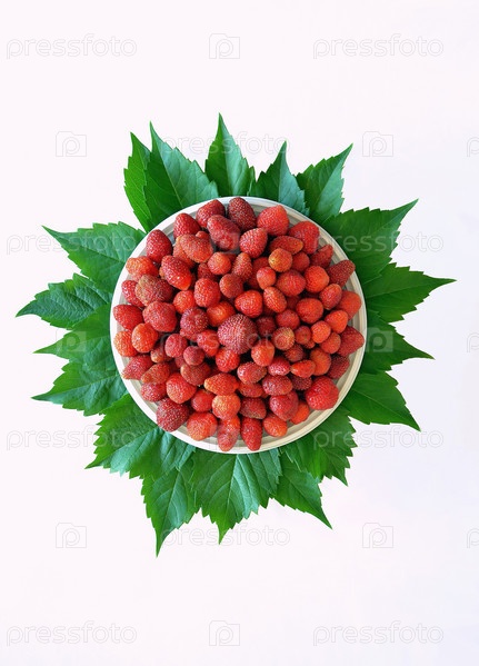 красная клубника в белой тарелочке на фоне зеленых листьев