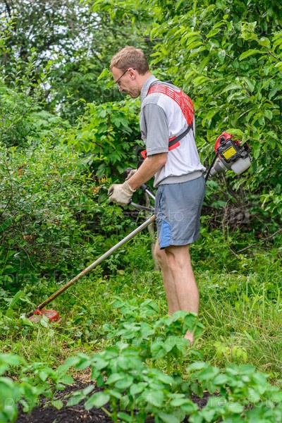 Мужчина стрижет газон