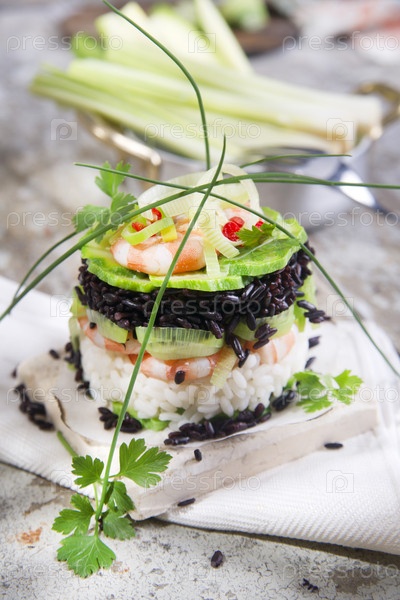 Черный и белый рис с креветками и цуккини