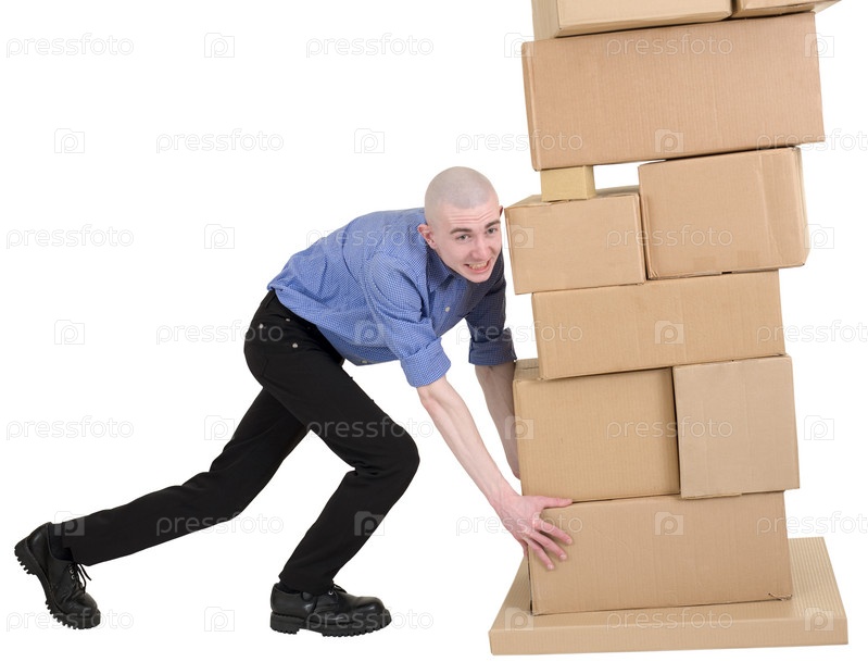 Мужчина обнимает кучу из картонных коробок на белом