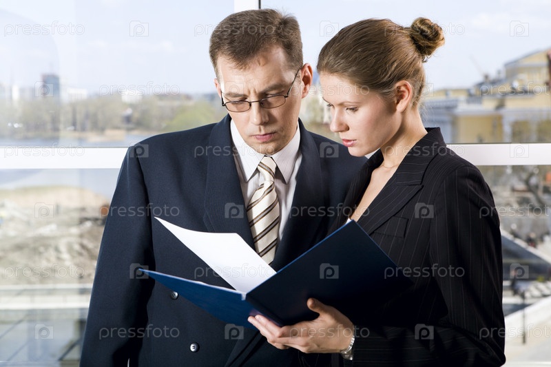 Портрет двух бизнесменов, читающих документы с концентрацией