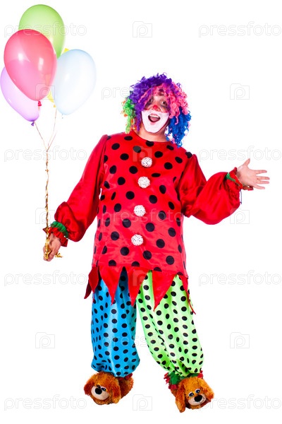 Мужчина, одетый в костюм клоуна на белом фоне