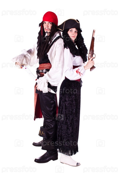 Мужчина и женщина, одетые как пираты,с пистолетом и саблей на белом фоне