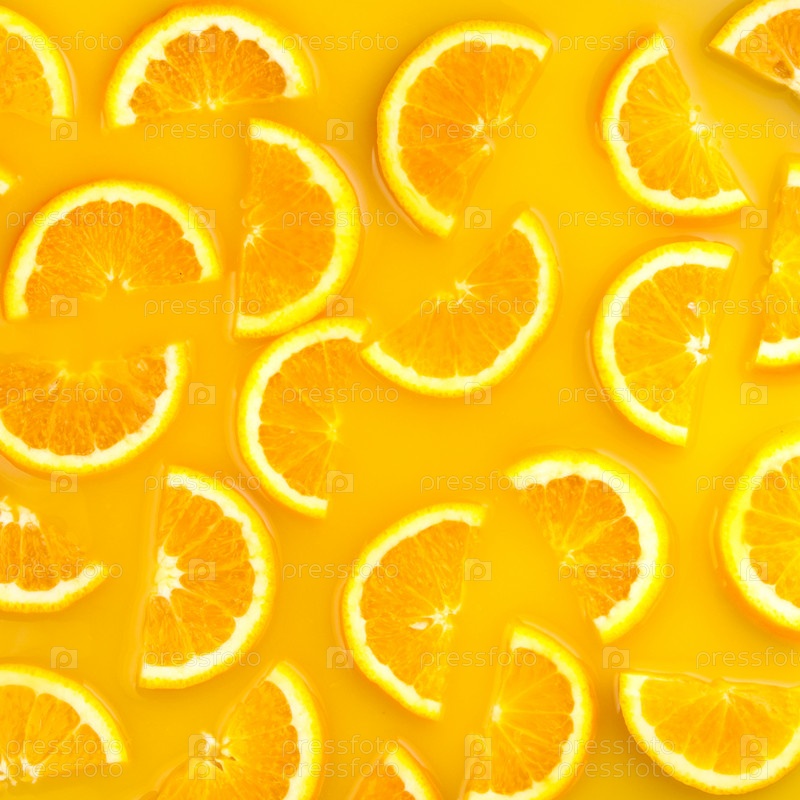 Нарезанные апельсины на оранжевом фоне
