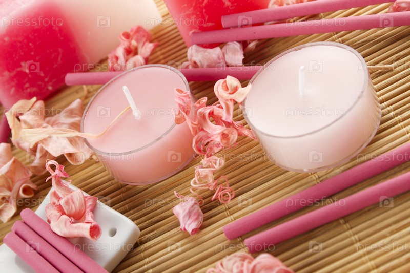 Розовые свечи, лепестки и ароматизированные палочки на бамбуковой циновке