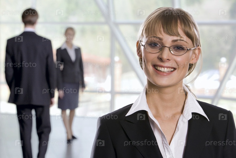 Улыбающаяся деловая женщина в очках и два ходящих бизнесмена на заднем плане