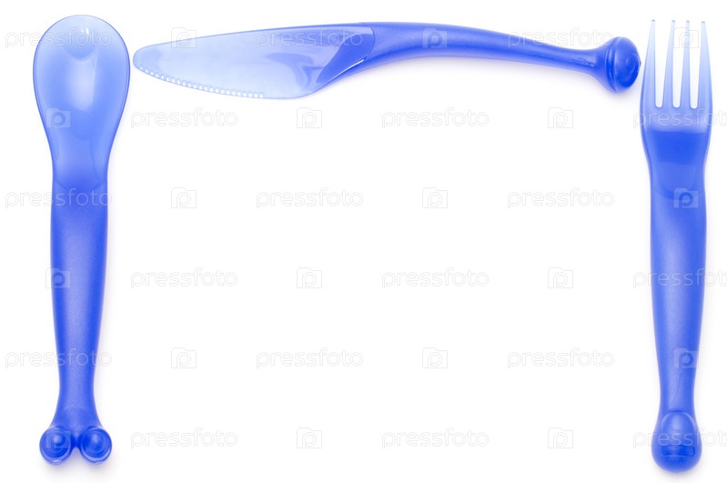 Объект на белом - кухонная утварь пластиковая ложка с вилкой