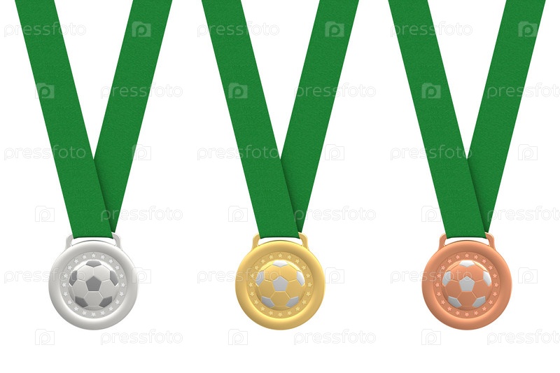 Футбольные медали с зеленым лентами на белом фоне