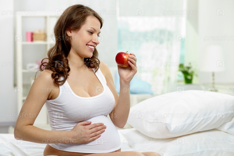 Счастливая беременная женщина с яблоком в кровати