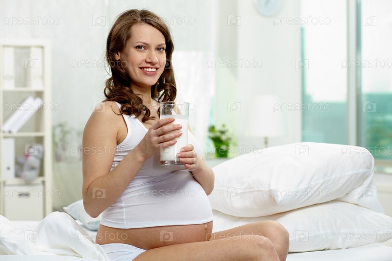 Счастливая беременная женщина со стаканом молока в кровати