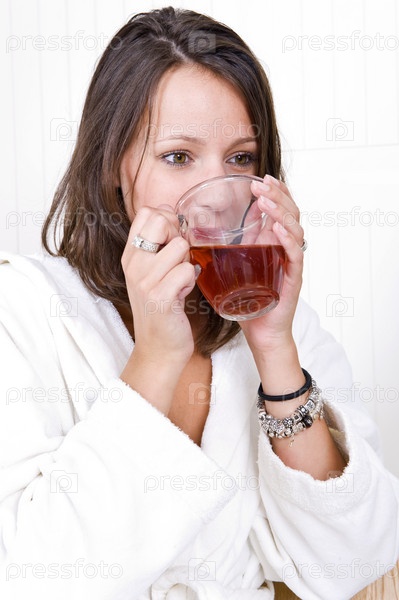 Молодая женщина, одетая в халат, пьет чай