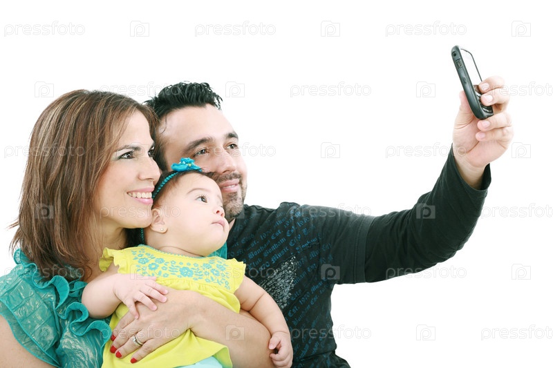 Семья из трех человек фотографируется на мобильный телефон