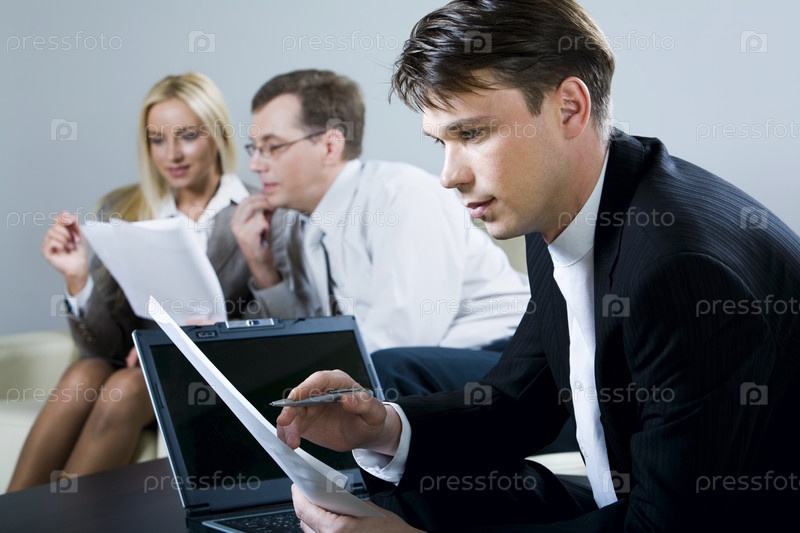 Портрет серьезного мужчины, читающего документ с открытым ноутбуком и двумя бизнесменами на фоне