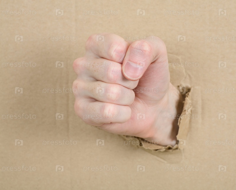 Жест мужской руки через отверстие в картон