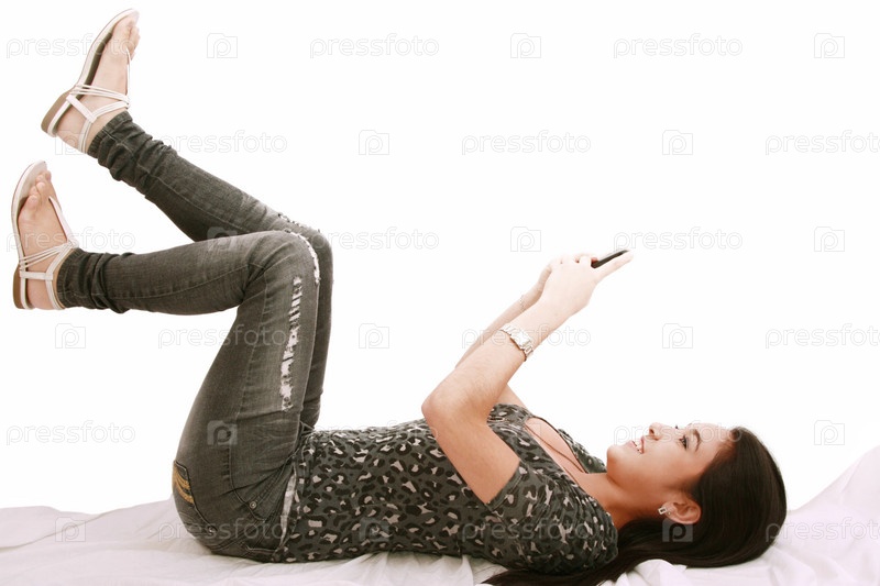 Девушка лежит на кровати и читает сообщения на телефоне