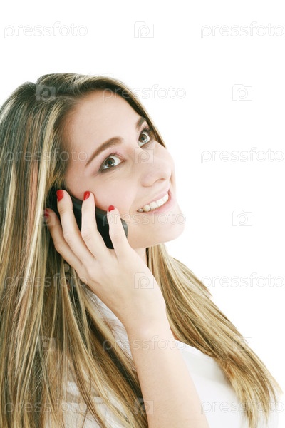 Красивая молодая женщина говорит по моюильному телефону на белом фоне