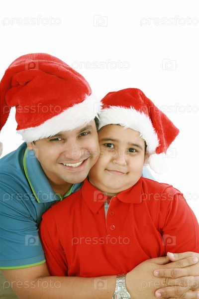 Счастливые отец и сын в рождественских колпаках смотрят в камеру