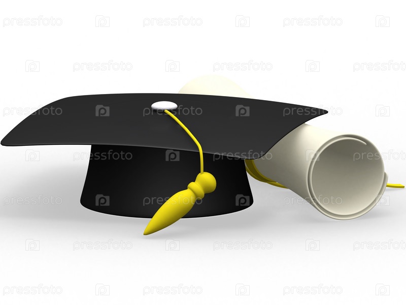 Диплом и шапка выпускника на белом фоне