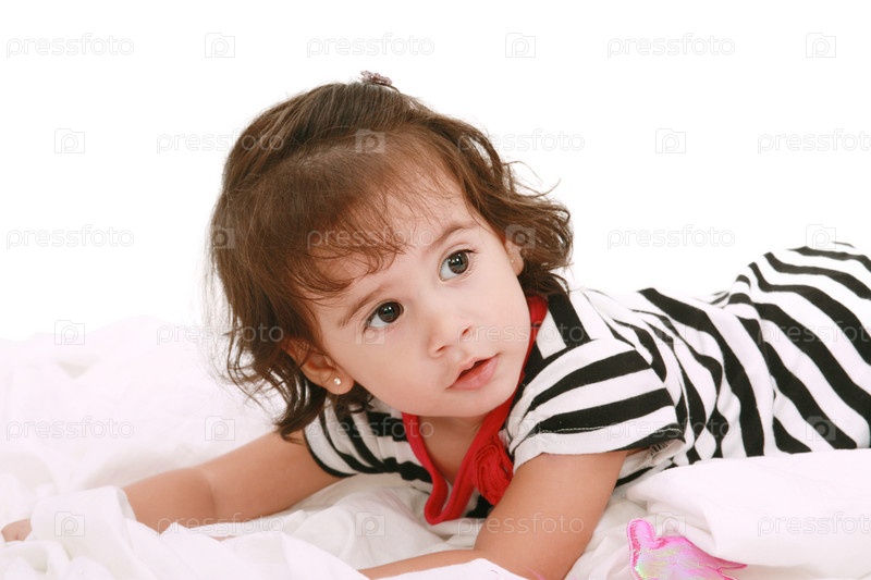 Красивая маленькая девочка, лежа на кровати
