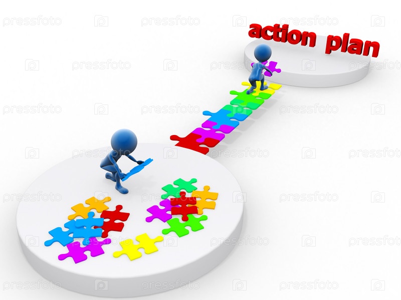 Символические люди составляют план действий из деталей головоломки