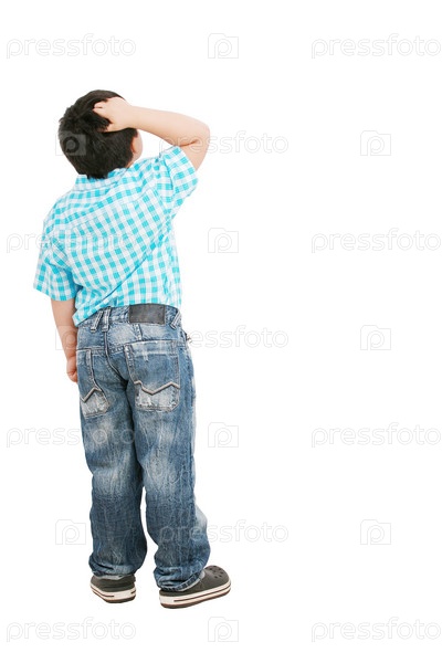 Задумчивый маленький мальчик стоит спиной и чешет затылок на белом фоне