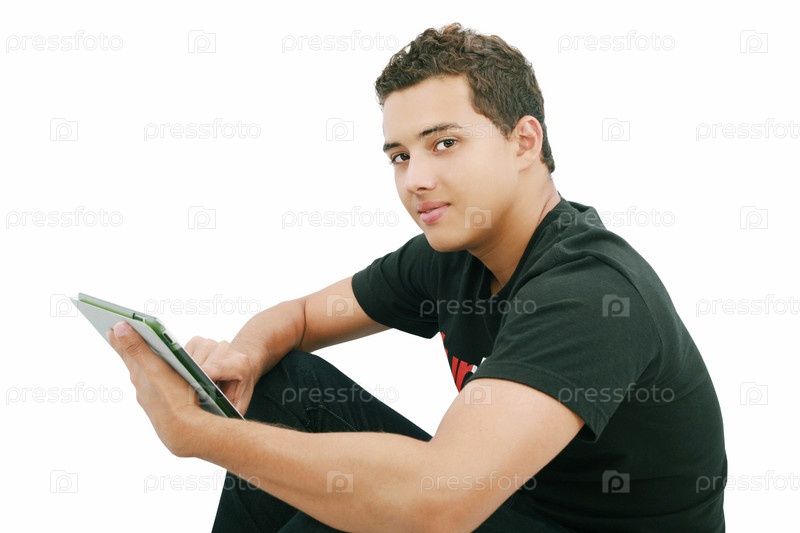Молодой человек с тетрадью сидит на белом фоне