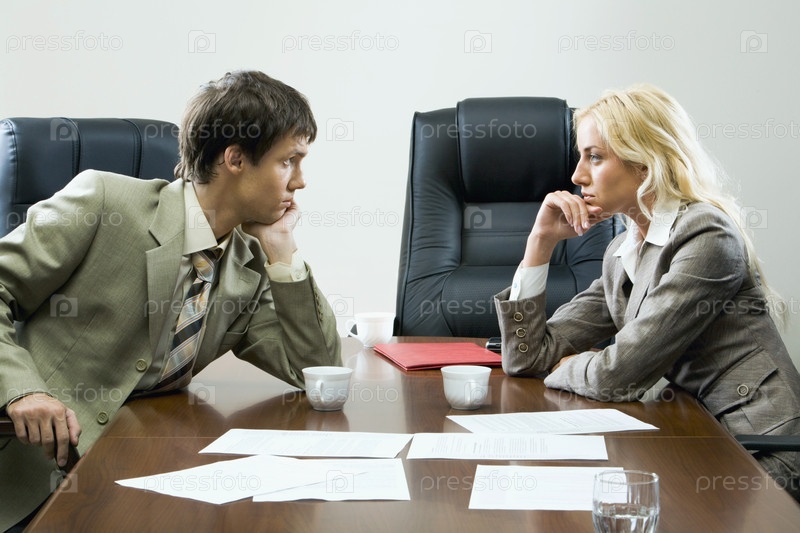 Два бизнесмена, сидящие перед собой и пристально смотрящих друг на друга за столом с чашками