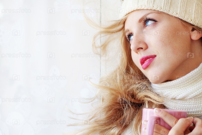 Молодая красивая женщина в шапке и шарфе с чашкой горячего кофе