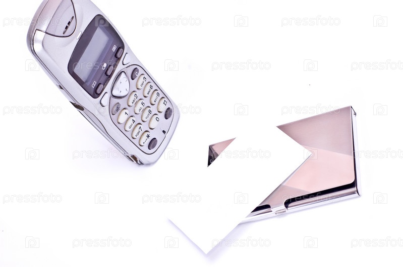 Визитная карточка в металлическом держателе для карт и телефон изолированы на белом