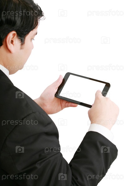 Бизнесмен держит сенсорный компьютер