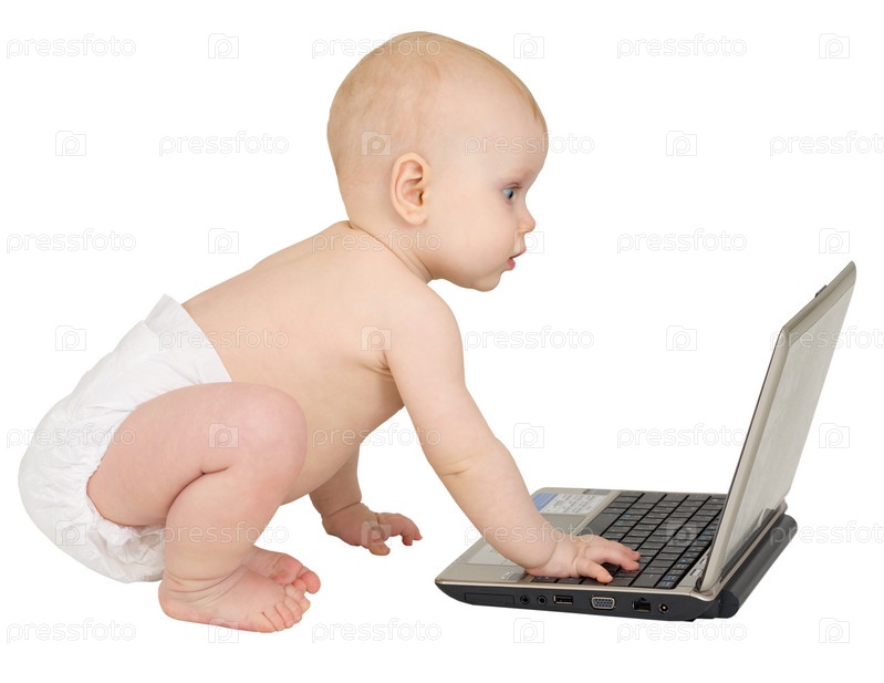 Малыш сидит на белом фоне с ноутбуком