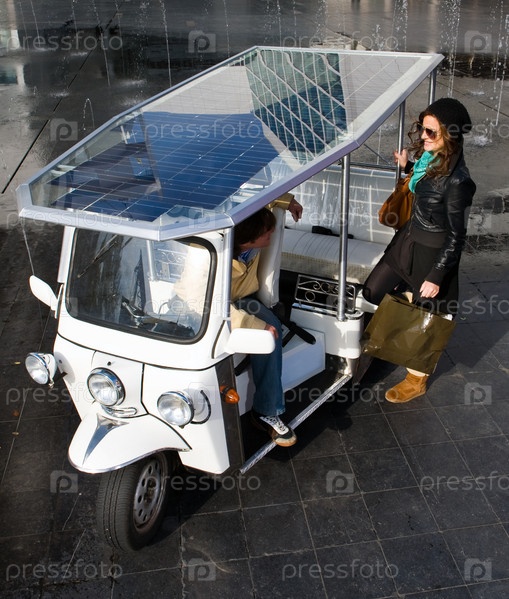 Молодая женщина у машины на солнечных батареях
