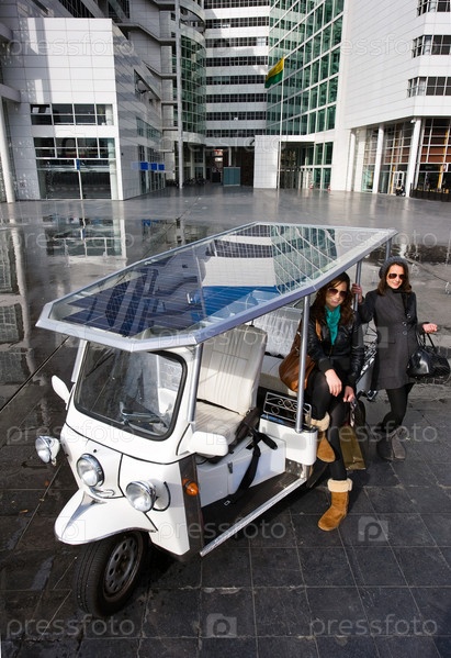 Две девушки у машины на солнечных батареях