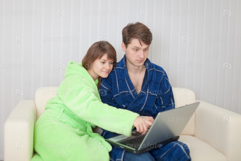 Молодая пара сидит в домашних халатах и изучает что-то на ноутбуке