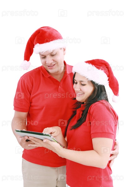Счастливая пара в рождественских колпаках с планшетным компьютером