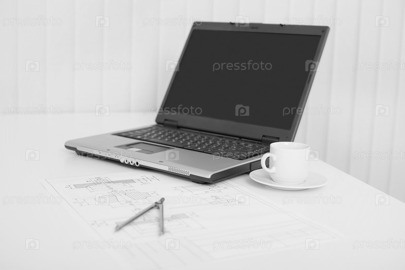 Ноутбук, чертеж, циркуляр на рабочем столе инженера - натюрморт