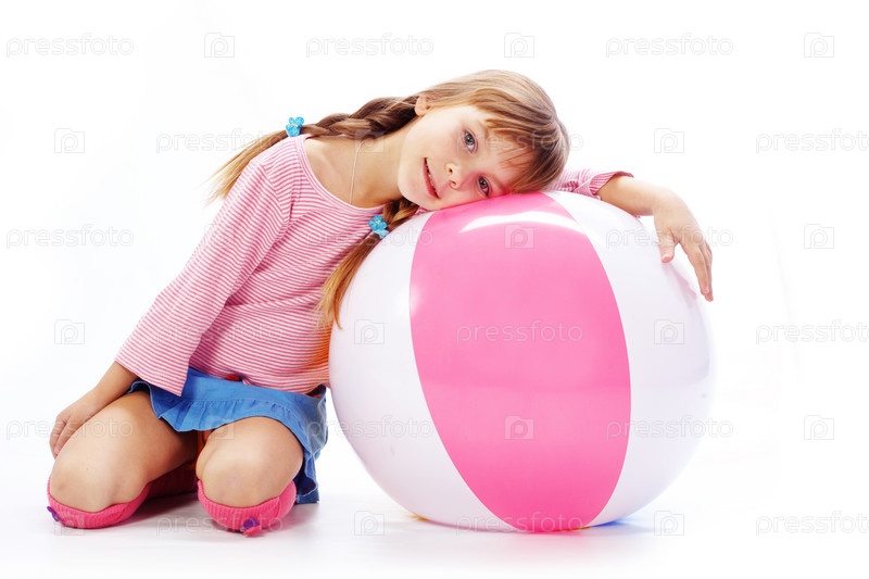 Девочка с большим мячом на белом фоне